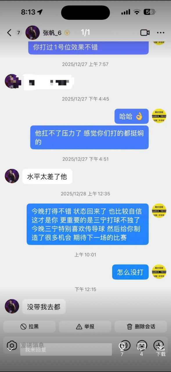 而且在北控這一波連續(xù)客場的征途中張帆并沒有跟隊,自從主場打廣東張帆賽季第二次拿到 0分后就沒有出場,在張帆與球迷的聊天中也可以看到,張帆壓根就沒有隨隊出征客場。